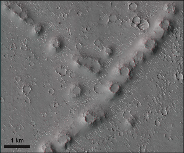 My former undergraduate research student David Lahowetz and I worked with Dr. David Crown of the Planetary Science Institute (www.psi.edu) to determine the fluid properties of lava flows on Mars. We measured the spacing of compressional ridges on lava flow surfaces from high-resolution digital elevation models. These data were then used in models of lava flow formation to estimate fluid parameters such as viscosity and yield strength, which can help us determine the nature of the eruptions that produced the flows.